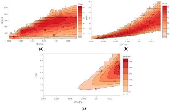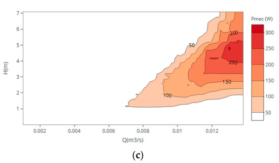 Hill charts of the propeller turbine were obtained for different operating conditions based on measured data. In Figure 2, three different hill charts are presented displaying the efficiency peak between 750 and 1000 rpm for flows between 15 and 25 m3/h and heads below 2 m. The best efficiency point (BEP) corresponds to an efficiency around 65% and 10 W, at a rotation speed of 750 rpm, for 0.0044 m3/s and head with 0.34 m. For a maximum flow of 0.013 m3/s, 4.8 m of head and 1500 rpm of rotational speed, the maximum mechanical power measured was approximately 330 W.