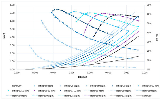 The experimental results of the performance evaluation curves are shown in Figure 3, where the total head is plotted as a function of the flow between the upstream and downstream pressure transducers, the efficiency, the rotational speed and the mechanical power. A total of 150 operating points was evaluated for eight set rotational velocity values [18].