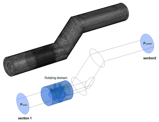 The boundary conditions set to Section 1 and Section 2 (Figure 4), were the turbine system inlet and outlet points measured, i.e., the recorded pressure in each transducers (located upstream and downstream the turbine and the pipe curve) was allocated to the inlet and outlet conditions. The respective rotational speeds achieved experimentally for each simulation were set for the impeller’s rotation. The rotating domain was set as a moving mesh. This definition controls the spatial frame and applies to all physics interfaces where the domains are rotating. Thus, these interfaces formulate the equations of Navier-Stokes in a rotating coordinate system, in the inner domain, and in the outer one in fixed coordinates. The Navier-Stokes equations for incompressible fluids are expressed in Equation (5):