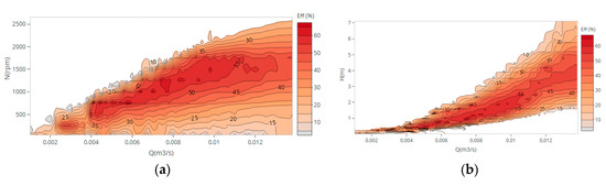 For turbomachines with same impeller’s size, the hydraulic parameters (i.e., flow, power and head) can be correlated based on affinity laws, where the efficiency can be estimated for various speeds. Based on this assumption, and according to expert references [21,22,23] Equation (1) can be simplified and modified as: