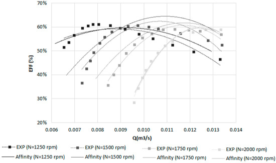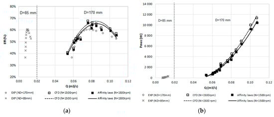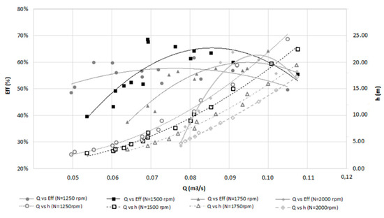 Figure 7 shows the new predicted efficiencies and head for D = 170 mm, given by Equation (6). The BEP achieved was 69% for a mechanical power of 2 kW, 0.069 m3/s of flow, 4.92 m of head and 1500 rpm using the new proposed affinity laws.