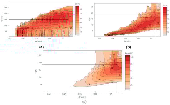 Hill charts obtained from new proposed affinity laws for discharges between 50 and 155 L/s: (a) Efficiency vs. flow and rotational speed; (b) Efficiency vs. flow and head; (c) Mechanical vs. flow and head.