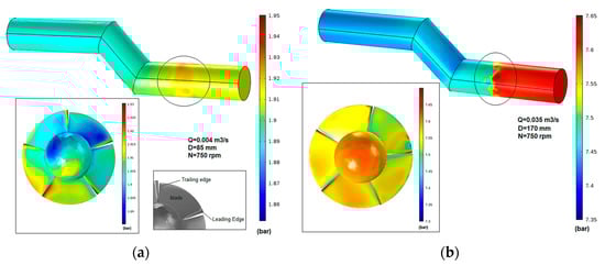 Pressure distribution contours for (a) D = 85 mm (design conditions-Model 1) and for (b) D = 170 mm (Model 2).