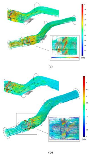 Velocity streamlines for N = 750 rpm: (a) D =85 mm; (b) D = 170 mm.
