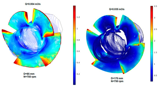 After validated and calibrated the CFD model, numerical simulations were performed for flow discharges between 2 and 13 L/s for the 85 mm impeller (Figure 5). The peak mechanical power measured for a maximum flow of 0.013 m3/s is around 320 W, with 4.76 m of head for 1500 rpm. The results are in accordance with experimental tests presented in Figure 2.