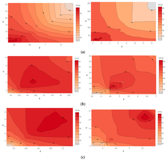 Efficiency hill charts for D = 85 mm (left) and D = 170 mm (right) for: (a) N = 750 rpm; (b) N = 1500 rpm; (c) N = 1750 rpm.