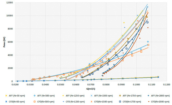 Figure 14 indicates the trend of power output curves in the experimental data using the modified affinity laws as well as for CFD analysis through Equation (6), which are approximately at the same level for different rotational speeds for D = 170 mm.