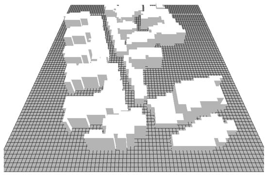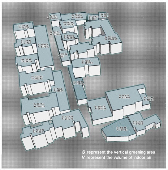 To calculate the indoor energy savings from different greening wall designs, we calculated the atmospheric energy in the building chamber of Yuhou Street. We calculated the volumes of indoor space, represented by the symbol V. The green wall area of each building was counted out, represented by the symbol S (see Figure 14).