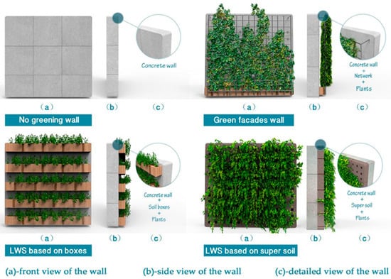 We summarized the common types of wall, which were no greening wall (scenario 1), green facade wall (scenario 2), LWS based on boxes (scenario 3), LWS based on super soil (scenario 4). The abstract pictures of the four scenarios of walls are shown in Figure 3.
