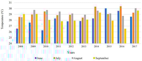 Meteorological data for this study came from the China standard climate monitoring station (No. 59316) located at 25°48′ N, 113°02′ E and 2.3 m above sea level. To make the research conform to the actual situation of Chenzhou, hour date of air temperature, wind speed, wind direction, and relative humidity were collected from the year 2008 to 2017. The monthly characteristics of the data were analyzed in Figure 4, and the typically hot summer month in Chenzhou is July.