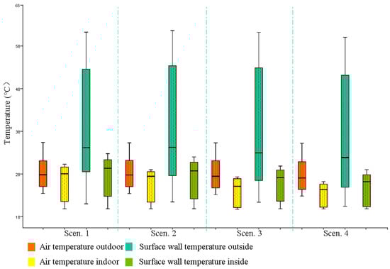 We selected the 24 h from 6 a.m. on 23 July 2016, to 6 a.m. on 24 July 2016, as a periodic research object. Four types of hourly data were collected. The four types of hourly data were the peak value of the outdoor air temperature, indoor air temperature, outside wall temperature, and inside wall temperature. We systematically compared the values of indoor and outdoor air temperatures and the values of the inner and outer wall temperatures in each of the four scenarios. Stem-leaf chart was adopted to show the distribution characteristics of the 24-h data for 16 types of simulated value (see Figure 5).