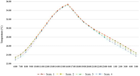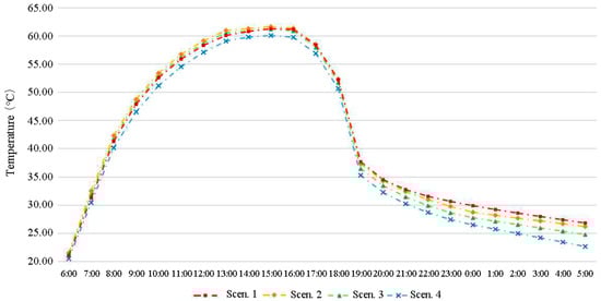 The peak outside wall surface temperatures from 6 a.m. to 6 a.m. on the following day of the four scenarios were counted and charted in Figure 10.