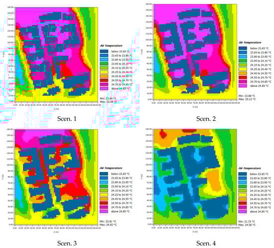 The maximum outdoor temperature lessened by LWS based on super soil was only 0.25 °C, indicating that green walls had little effect on the cooling of outdoor air. Distribution of outdoor temperature at 8 a.m. affected by different walls is shown in Figure 7.