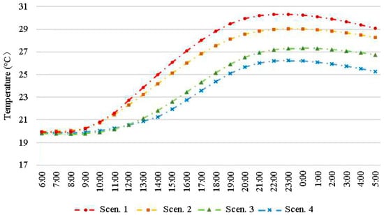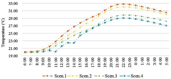 Then, we collected the peak inside temperatures from 6 a.m. to 6 a.m. on the following day of the four scenarios and charted them in Figure 9. The following features can be seen. The indoor cooling performances of the three green walls witnessed a gradual rise to the top point at 10 p.m., before a very slow decline. LWS based on super soil showed superiority in cooling indoor air by cooling 4.5 °C, followed by LWS based on boxes cooling 3.5 °C and green facades wall cooling 1.5 °C.