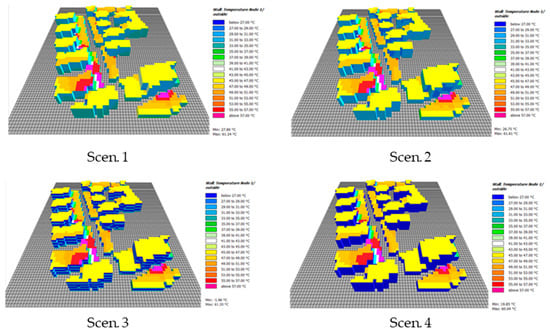 The outside wall surface temperature of the four scenarios at 4 p.m.