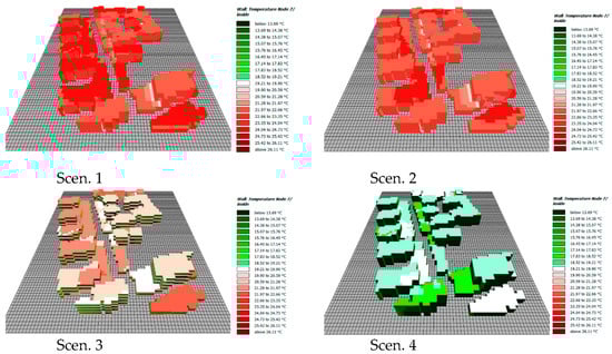 We compared the inside wall hourly temperature of different green wall design from 6 a.m. to 6 a.m. on the next day of Yuhou Street. At 10 p.m., the inside wall surface temperature of the four walls all reached their peak values. However, different building chambers had different temperatures. The temperature distributions of the four kinds of walls at 10 p.m. are shown in Figure 12.