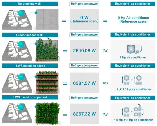 According to the refrigeration power of household air conditioners, the equivalent conversion of refrigeration power for four kinds of walls was carried out. The refrigeration power of the green facades wall system in Yuhou Street was similar to that of an air conditioner with 1 Hp. Similarly, the LWS based on boxes was equal to two 1.5 Hp air conditioners, and the LWS based on super soil corresponded to a combination of one 1.5 Hp and one 2 Hp.