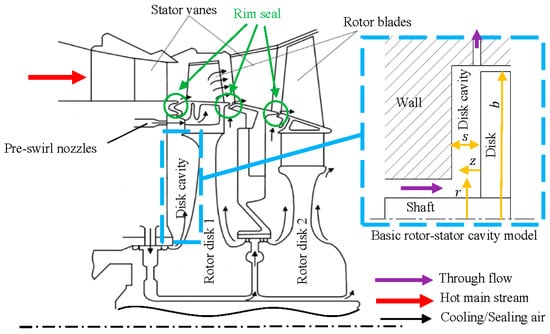 Gas turbines are widely used in the fields of aircraft propulsion and power generation. They play a significant role in the civil economy and national defense. The disk cavity, shown in Figure 1, is a complicated structure of the secondary air system in a gas turbine. It is the wheel space between the rotating disk and the stationary casing. In the disk cavity, the rotating disk is routinely used over a long time to distribute the cold air and prevent the ingress of the hot gas into the cavity through the rim seal. According to the experience of the authors’ group, the amount of secondary air used in the disk cavity comprises around 6% of the mass flow at the compressor inlet []. Since it is quite difficult to further improve the efficiency of the compressor stages, it is a promising way to increase the efficiency of a gas turbine by reducing the amount of cooling and sealing air. It requires insight into the pressure distribution, the axial thrust, the disk frictional losses, and the temperature field at each working condition. The foundation and the premise are to investigate the flow and the heat transfer within the basic rotor-stator cavity model (see Figure 1). The flow is firstly extracted from the compressor stages and pumped into the disk cavity. Then it moves radially outwards and cools down both the disk and the wall. Finally, it enters the turbine cascade and prevents the hot gas from entering the cavity. In this study, the receiver holes in the turbine disk are not discussed.
