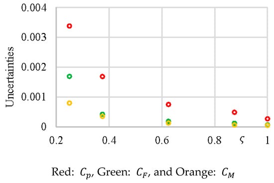 The measured range of the pressure transducer is up to bar (absolute pressure). The measured range of the thrust transducers and the torque meter are and . The parameter ranges of the output voltage signals are as follows: from to for both the pressure transducer and the torque meter, while from to for the axial thrust transducer. The absolute accuracy of the data acquisition system is 4.28 mV. The relative error of the pressure transducer, the torque transducer, and the axial thrust transducer are 1% (FS), 0.1% (FS), and 0.5% (FS), respectively. The uncertainties of the measured results are calculated with the root sum squared method. Each result of (defined in Equation (1)), , and is the average value of 1000 samples. The distributions of the results are considered as the normal distributions, whose distribution coefficient is 1.96 (95% confidence level). The uncertainties of the measured pressure, axial thrust, and frictional torque are 40.4 (Pa), 0.024 (N), and 3 (Nm), which are calculated in []. Then the corresponding uncertainties of , , and are plotted versus in Figure 3.
