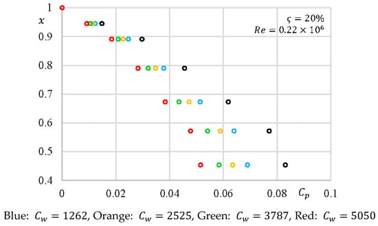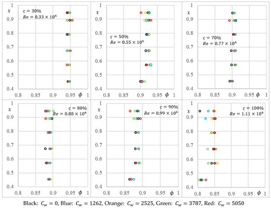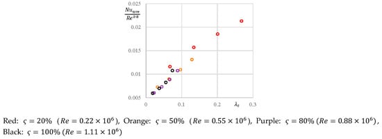 When is not large enough, the parameter is primarily affected by in a rotor-stator system [,]. In this study, the values of do not exceed 0.3, which is in the parameter range: [,]. The parameter is, therefore, analyzed according to . It is noted that the exponent value of 0.8 is typical for turbulent boundary layers, as put forward by Schlichting []. Aus der Wiesche [] pointed out that small deviations exist with regard to the exact exponent value in the literature. However, it should be remarked that these deviations are typical of minor importance in comparison with the experimental uncertainty levels occurring in actual systems. The amounts of increase with the increase of , shown in Figure 13. The values of are almost in a linear relationship with at a fixed value.