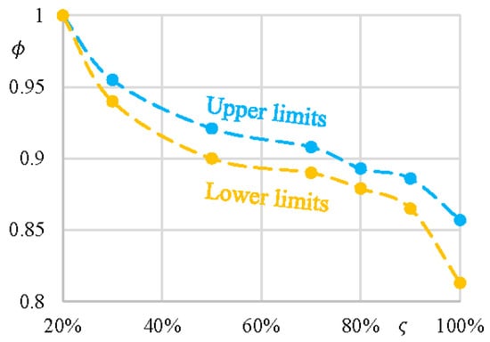 The parameter , defined in Equation (15), is used to show the impacts of on . The results are shown in Figure 5. The value of increases as increases. With the increase of , the amounts of decrease. The values of decrease by 15% to 19% when arrives at the maximum value. With the increase of , the maximum and the minimum values of are compared in Figure 6 for various . In the parameter ranges and , a substantial decrease of is found. The decrement, however, becomes smaller with the increase of in the parameter range: .