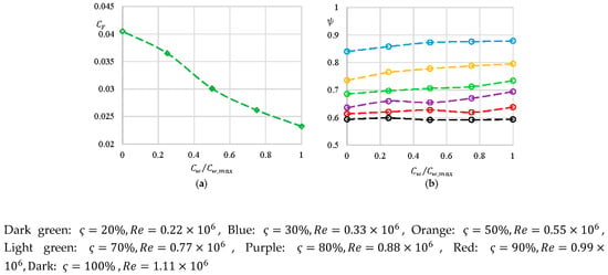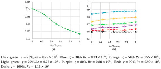 To reduce the pollutant emitted into the air, the efficiencies of the gas turbine should be improved. One of the important means is to reduce the disk frictional losses and the leakage losses under different working conditions. The key is to determine how the amount of air impacts the moment coefficient. At the working condition , the values of increase with increasing , shown in Figure 8a. The increasing trends are in accordance with those in []. It is speculated that the gradient of the tangential velocity near the rotor surface increases with the increase of , which results in the rise of the wall shear stress []. The parameter , defined in Equation (17), is used to show the variations of with increasing . As shown in Figure 8b, the numbers of fluctuate with the increase of . As increases, the amounts of decrease in general, shown in Figure 8b. When increases from to , the values of drop by around 17.5%.