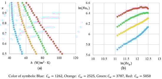 According to the measurements, the radial distributions of are plotted versus in Figure 9a for (). Four values of are investigated, namely 1262, 2525, 3787, and 5050. Each value of is the average values at three circumferential positions on the fan-shaped TLC () at a certain radial coordinate. The amounts of decrease toward the outer radius of the disk. At a lower radius, the values of are relatively larger. The rise of contributes to stronger local heat transfer capacity. As increases, the increments are much larger at a low radius. In the literature such as those in [], the effects of and on the distributions of have been discussed. The amounts of are estimated with the power law, written in Equation (18) []. Figure 9b illustrates the effects of on . With the increase of , the values of increase in general. The amounts of increase as increases. The increases in versus become less intense when increases.