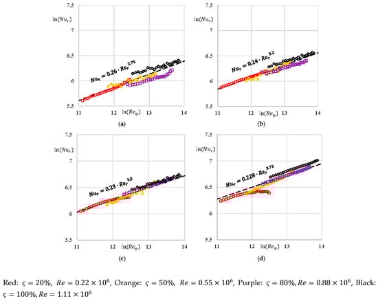 On the basis of the experimental results, the variations of on for four values of (or ) and four values of are depicted in Figure 10. The increases of follow the same trend for the four values of at a fixed value in general. The values of the constants in Equation (18) ( and ) are determined with the method of least-square. The method simplifies the determinations of the above two parameters. The drawback, however, is that this reduces the accuracy of determining the parameters in Equation (18). It is noted that for and , the increment of versus become smaller in the parameter range: . Above results also have big disparity with those from the determined correlations. The differences deserve further investigations. The values of decline as increases while those of increase with the increase of .