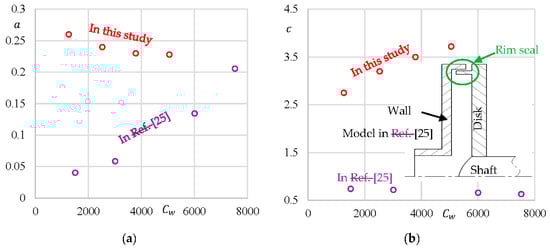 In Figure 11, the amounts of and are compared with those in []. The results of and by measurements in this paper are much larger than those by numerical simulations in []. The variations also show the different trends. The discrepancies cannot be answered from the available data. In [], there is a rim seal at the outer radius of the cavity, while the cavity is directly connected to the environment in this paper. It is, therefore, speculated that the large differences are due to the difference of the geometry at the outlet of the disk cavity, which obviously results in the different temperature gradients.