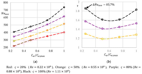 In a rotor-stator cavity, the performances of heat transfer besides the flow patterns are decided by . The parameter is used to show the average heat transfer capacity. Figure 12a depicts the changes in for various . With the increase of as well as , the values of increase. The same trends can also be found in []. The parameter , written in Equation (19), is used to show the change rate of . The parabolic-shaped curves are depicted in Figure 12b. The amounts of increase by up to 85.7% when increases from 20% to 100%. The special shape of deserves further investigations.