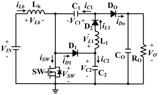 The proposed converter consists of two capacitors C1 and C2, two diodes D1 and D2, and an inductor L1, in addition to the conventional boost components Lb, DO, CO, and a switch (SW). C1 is located between boost inductor Lb and output diode DO, and acts as a charge pump capacitor to increase the voltage gain. L1 and C2 reduce the voltage stress of SW by dividing the output voltage VO. D1 and D2 provide a charging or discharging path for C2.