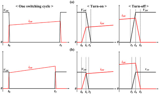 Voltage and current waveforms of the switch: (a) conventional boost converter, (b) proposed converter.