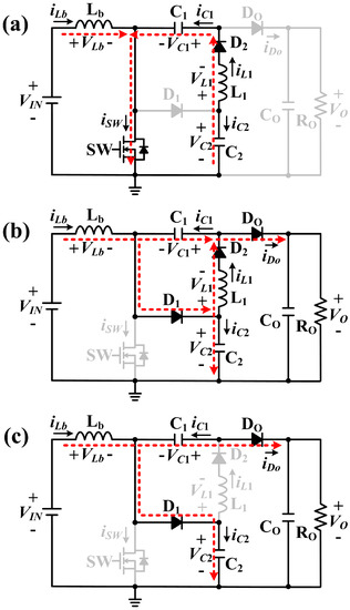 Mode 2 (t1~t2): The second operation (Figure 4b) starts at t = t1 when SW turns OFF. During mode 2, D2 stays ON, and D1 and DO are turned ON. When SW is turned OFF, the anode voltage of D1 is VC2 because VLb = VC2 − VIN according to the voltage second valance law. The cathode voltage of D1 is VC2 − ΔVC2 because C2 was discharged in Mode 1, so D1 is turned ON. After D1 is turned ON, the anode voltage of DO is VC1 + VC2 and cathode voltage is VO − ΔVO because CO was discharged in Mode 1. Therefore, DO is turned ON because VC1 + VC2 = VO in steady state. In the same manner, after D1 and DO are turned ON, D2 is turned ON because the anode voltage of D2 is VC1 + VC2 and the cathode voltage is VO − ΔVO. and , so