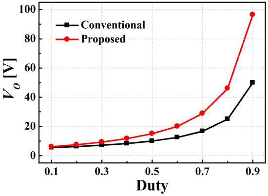 VO versus D (Figure 6) for L1 = 10 μH, fS = 1 MHz, IO = 150 mA, VIN = 5 V, and 0.1 ≤ D ≤ 0.9 was calculated using Equation (9) for the proposed converter, but the conventional boost converter was calculated using their voltage gain equations. To have VO = 40 V for given VIN, D = 0.775 was applied to the proposed converter, whereas D = 0.875 was applied to the conventional boost converter. At given VIN and D, the proposed converter had higher VO than the conventional boost converters.