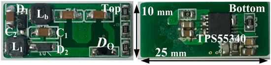 The proposed boost converter (Figure 7) was designed to operate at VIN = 5 V, VO = 40 V, 30 ≤ IO ≤ 150 mA, and fS = 1 MHz. The inductances were set at Lb = 33 µH and L1 = 10 µH. Capacitances C1 and C2 were both set at 1 µF. The experimental circuit was implemented using the following miniature components (Table 1): TPS55340 DC-DC controller (Texas Instruments Inc., Dallas, TX, USA), which has an internal n-MOS switch (40 V, 5A), RB160M-60TR diodes (Rohm Co.), IFSC-1515AH-01 (Vishay Inc.) and SSMC252008R47SC (SST Inc.) chip inductors, and multilayer ceramic chip capacitors of a size 3.2 mm × 1.6 mm. The chip inductors and capacitors have series resistances given in the parentheses. To ensure a fair comparison, the conventional boost converter used the same components.