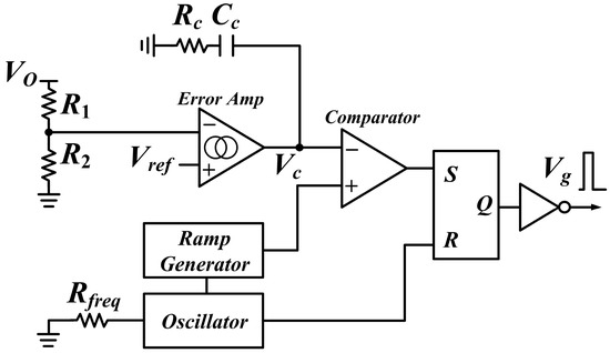 The TPS55340 regulates the output voltage with current mode PWM control, and has an internal oscillator. The pulse width modulation of the gate pulse Vg is achieved in the control circuit for the proposed converter (Figure 8) as follows; each clock pulse resets the flip-flop and the ramp generator, which sets Vg to the ‘high’ state; the output Vc of the error amplifier increases as VO increases; the comparator output changes from ‘low’ to ‘high’ when the output voltage of the ramp generator exceeds Vc, which changes the inverter output Vg to the ‘low’ state. When the output current IO increases/decreases abruptly, VO decreases/increases instantly, which increases/decreases Vc. Thus, the pulse width of Vg increases/decreases to keep VO constant.