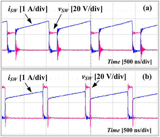 The voltage and current waveforms of SW (Figure 9) were measured at VIN = 5 V, VO = 40 V, IO = 150 mA, and fS = 1 MHz. The voltage stress of the proposed converter (Figure 9a) was lower than that of the conventional boost converter (Figure 9b) because the voltage stress was in the proposed converter but VO in the conventional boost converter. The current stresses of the proposed converter and the conventional boost converter were similar. The current waveforms of the diodes are shown in Figure 10. The diodes current stresses of the proposed converter was lower than the conventional boost converter. The time-averaged values <iD1>, <iD2>, and <iDo> were all equal to IO.