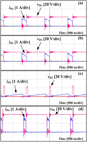 Diode waveforms of the proposed converter. (a) Do, (b) D1, (c) D2, and diode waveform of the conventional boost converter. (d) Do measured at VIN = 5 V, VO = 40 V, IO = 150 mA and fS = 1 MHz.