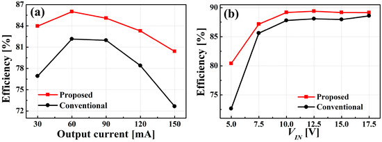 The curves of ηe on IO (Figure 11a) were measured at 30 ≤ IO ≤ 150 mA, VIN = 5 V, VO = 40 V, fS = 1 MHz. At IO = 30 mA, ηe was 84.0% for the proposed converter and 76.9% for the conventional boost converter. At IO = 150 mA, ηe was 80.4% for the proposed converter and 72.6% for the conventional boost converter. The curves of ηe on VIN (Figure 11b) were measured at 5 ≤ VIN ≤ 17.5 V, IO = 150 mA, VO = 40 V, fS = 1 MHz; ηe at VIN = 17.5 V was 89.1% for the proposed converter and 88.6% for the conventional boost converter. The ηe of the proposed converter was up to 7.8% higher than the conventional boost converter at VIN = 5 V. The proposed converter had a high ηe over the entire input voltage and output current ranges.