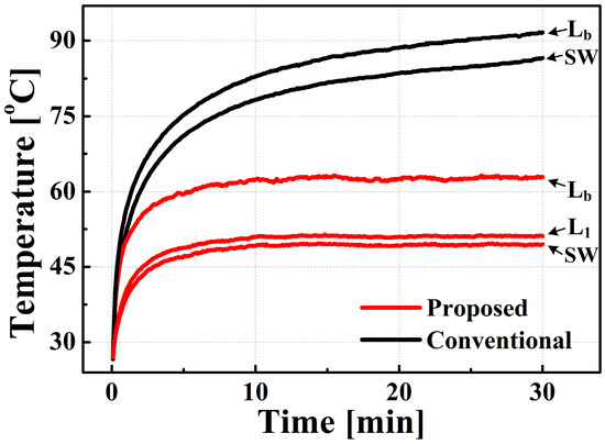 The temperatures of SW and inductors (Figure 12) were measured for 30 min using a digital temperature recorder (GL-220, GRAPHTEC), while the converters were operated at VIN = 5 V, VO = 40 V, fS = 1 MHz, and IO = 150 mA. In the conventional boost converter the switch stabilized at 86.6 °C and the inductor stabilized at 91.7 °C, but in the proposed converter, the switch stabilized at 49.5 °C and the inductor stabilized at 62.9 °C. These data indicate that the proposed converter generated less heat loss than the conventional boost converter.