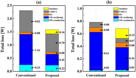 The circuit losses were calculated using a circuit simulator at VO = 40 V, IO = 150 mA, fs = 1 MHz, and VIN = 5 V (Figure 13a) and 15 V (Figure 13b). The total power losses were 1.59 W (proposed) and 2.31 W (conventional) at VIN = 5 V, and they were 0.68 W (proposed) and 0.78 W (conventional) at VIN = 15 V. These results show that the proposed converter had lower power loss than the conventional boost converter at both VIN = 5 V and 15 V. The losses in the switch were 0.65 W (proposed) and 1.41 W (conventional) at VIN = 5 V, and they were 0.38 W (proposed) and 0.63 W (conventional) at VIN = 15 V. The proposed converter reduced the switching loss by decreasing VSW. Additionally, the snubber loss of the proposed converter was 0.16 W at VIN = 5 V, and it was 0.15 W at VIN = 15 V. The proposed converter reduced the snubber losses by placing L1 at the output stage and eliminating the resonant current in the snubber circuit.