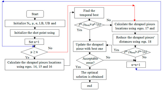 To apply the mine blast algorithm, the algorithm must have a primary point at the beginning, where the first mine is blasted; this is known as the initial point or first shot point. Then, explosion of the mine bomb generates the thrown segments of shrapnel that are produced from the blast of the mine bomb; these pieces of shrapnel collide with others in the same landmine farm, assisting in exploring it. This leads to finding the optimal solution, which is achieved by finding the most fulminatory mine position. Firstly, the initial point, which is called the primary shot point, , is considered via on the lower and upper bound values, which can be given as the following:
