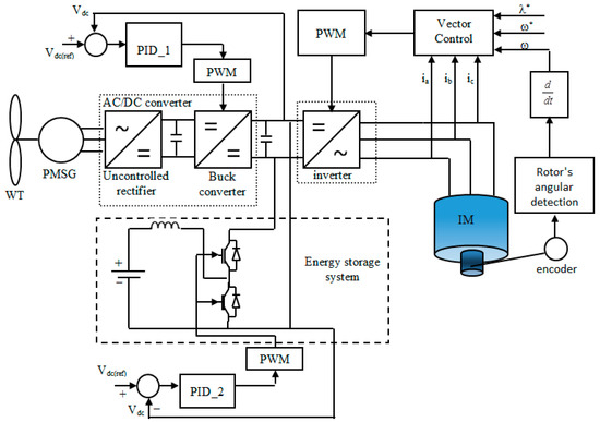 There are three basic control circuits in this research, the first circuit controls the DC-link using the optimal PID controller based on the mine blast algorithm to preserve the produced voltage of the buck DC–DC converter at the required estimate. The second circuit, based on an optimal PID controller, controls the charging and discharging regulator of the battery. Thus, the battery will retain power if the wind power generated is greater than the desired power of the load, and conversely, the battery will emit power to feed the load when the wind produces less energy than desired. The third circuit is the vector control which it can use to meet the velocity of the desired induction motor by controlling the output DC–AC inverter voltage even after any change in wind speed or load variation.