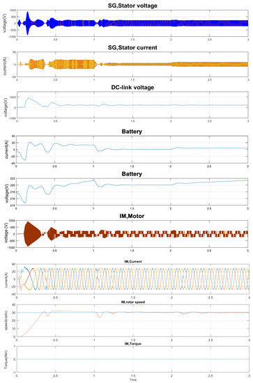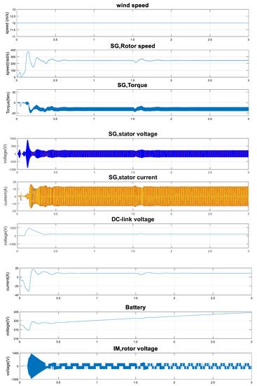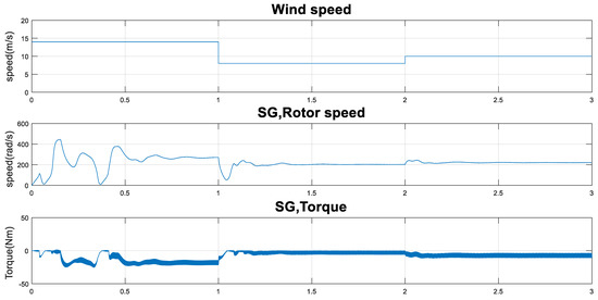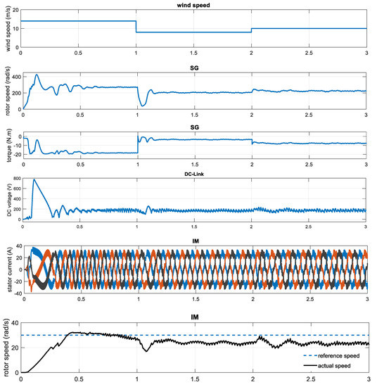 Figure 4 presents that wind speed changes between the two different values 8.0 m/s and 14.0 m/s. It was observed that with higher velocity of the wind, the generator output torque of the WT gets larger; consequently, the value of the generator rotation speed increases, which leads to increasing values of generator stator current, voltage, and IM stator power.
