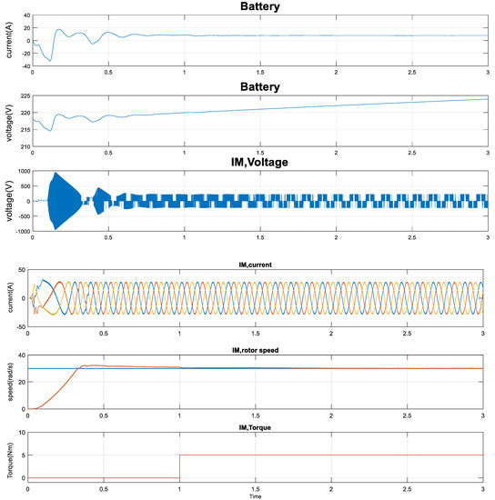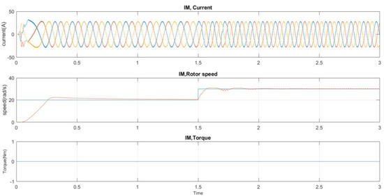 The results obtained based on the proposed optimal PID control are compared with the obtained results using conventional PID control, as shown in Figure 7. From Figure 4 and Figure 7, one may notice that the system with the proposed optimal PID control has better performance than in the case of using classical PID control, as the high stator current harmonics and the IM rotor speed do not track the reference values. Also, it can be seen that the maximum overshoot is 8% and the steady state error in the rotor speed is zero when using the optimal control, while when using conventional PID, the maximum overshoot is 12% and the steady state error in the rotor speed is 7 rad/s.