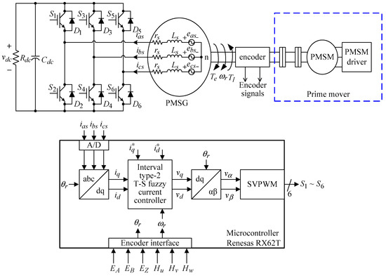 Figure 1 introduces the system configuration of the PMSG based on the IT2 T-S fuzzy control systems. The prime mover of the PMSG consists of a PMSM with a PMSM driver. The input torque of PMSG is provided by the prime mover. The encoder signals on the shaft are utilized to calculate rotor speed and rotor position. Three-phase winding currents are sensed through the analog-to-digital converter (ADC). Then the abc-frame currents are transformed to dq-frame currents. The current commands and dq-frame currents are implemented in the IT2 T-S fuzzy current controller to calculate the dq-frame voltage commands. The corresponding duty ratio of six switches is determined via space-vector pulse-width modulation (SVPWM). All the control and transformation schemes are digitally realized using the microcontroller Renesas RX62T (Renesas Electronics Corp., Tokyo, Japan).