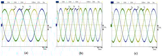 Let the current command be , . In this case, the three-phase winding current will be balanced with peak value 15 A. Figure 4a–c show the winding current waveforms measured at different generator speeds. Table 4 summarizes the error and total harmonic distortion (THD) of the measured waveforms. It can be found that the current command tracking error is less than 2.5% in all conditions. The winding current can exactly track the current command. Moreover, the THD is less than 2%, and this means winding currents are nearly sinusoidal.