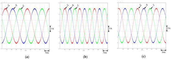 To improve the scientific merit of this paper, the simulation is performed by PSIM Ver. 10. The same conditions with Figure 4a–c are simulated and shown in Figure 5a–c, respectively. From the simulation results, it can be found that the three-phase winding currents are balanced with peak value 15 A. Moreover, the THD is less than 2%; this means winding currents are nearly sinusoidal.