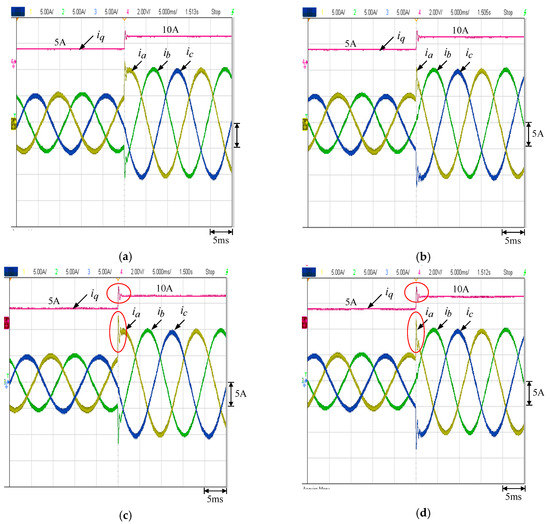 Second, the speed is 1200 rpm and the current command is going from zero to a constant value. Figure 7a,b show the winding current waveforms of the current command that goes from zero to a constant value. The current tracking capability is verified.