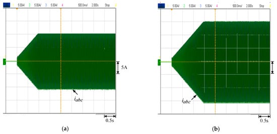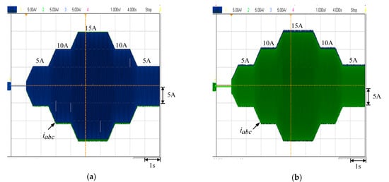 Finally, the speed is 900 rpm and 1500 rpm, respectively, and the current command is varying as 0 A→5 A→10 A→15 A→10 A→5 A. Figure 8a,b show the winding current waveforms, respectively. It is obvious that the winding current can track the variable current command very well. The output power of the PMSG can be adjusted by changing the current command in this situation.